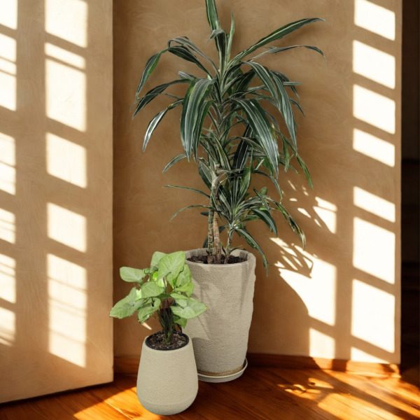 La composición mezcla el follaje amplio y dinámico del Syngonium verde con la estructura elegante de la Dracaena Warneckii, logrando un conjunto equilibrado ideal para livings, oficinas o espacios luminosos. 🌱