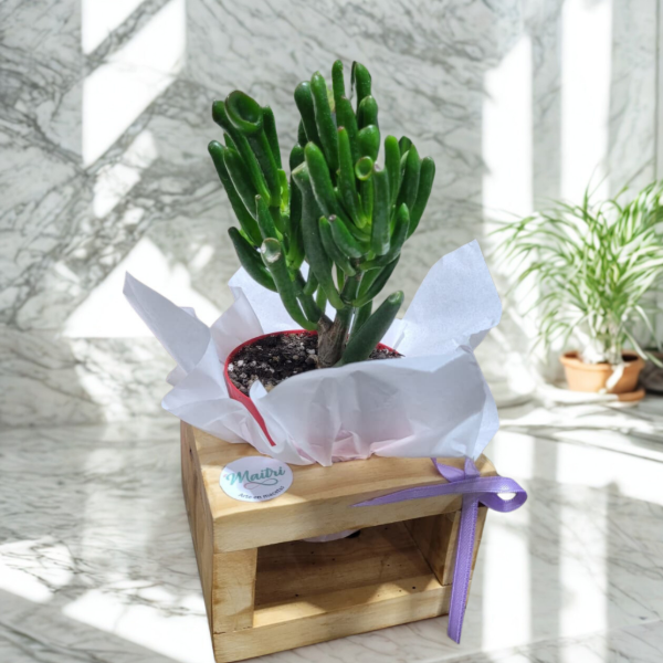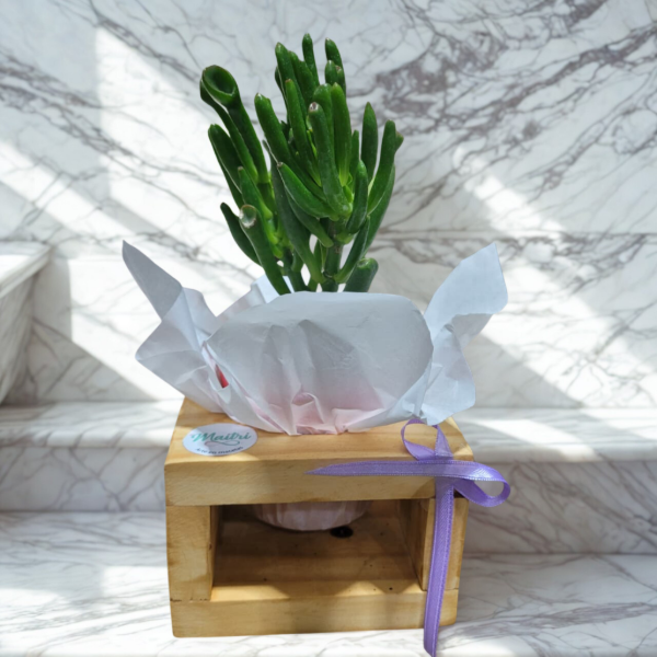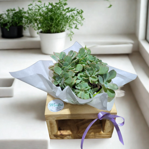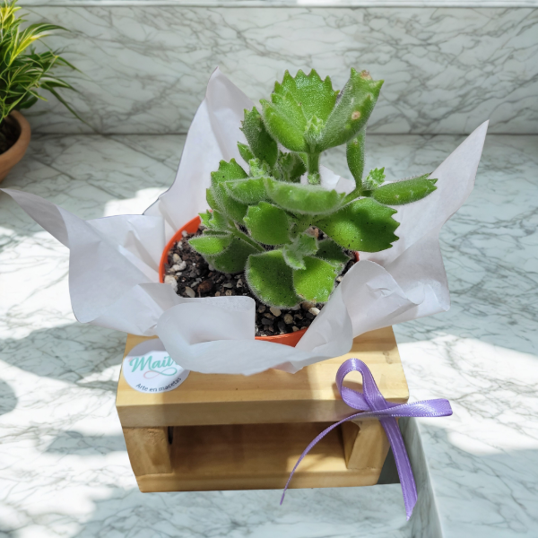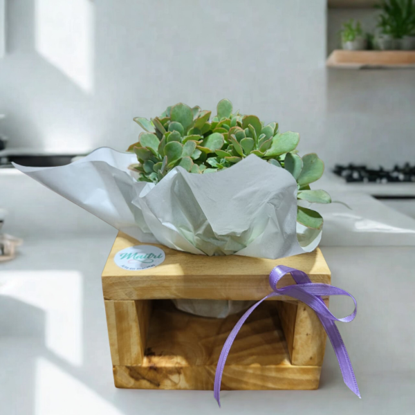 Una suculenta presentada con un detalle especial, pensada para regalar o para sumar un toque natural y cálido a cualquier espacio ✨ La planta se entrega envuelta en papel de seda con lazo y colocada en un portamaceta de madera barnizada, logrando una presentación simple, elegante y lista para obsequiar.