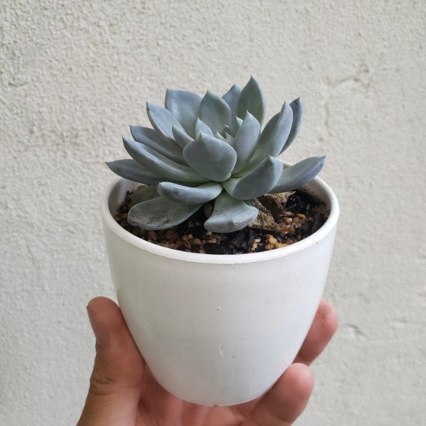Es de crecimiento lento y muy fácil de cuidar. No manipular demasiado las hojas para conservar su capa protectora natural (esa textura blanquecina es parte de su encanto y salud).