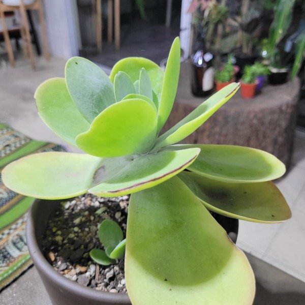 De hojas grandes, redondeadas y carnosas, dispuestas en forma de roseta, el Kalanchoe thyrsiflora se destaca por sus tonos verde grisáceos con bordes rojizos que se intensifican con buena luz. ☀️✨